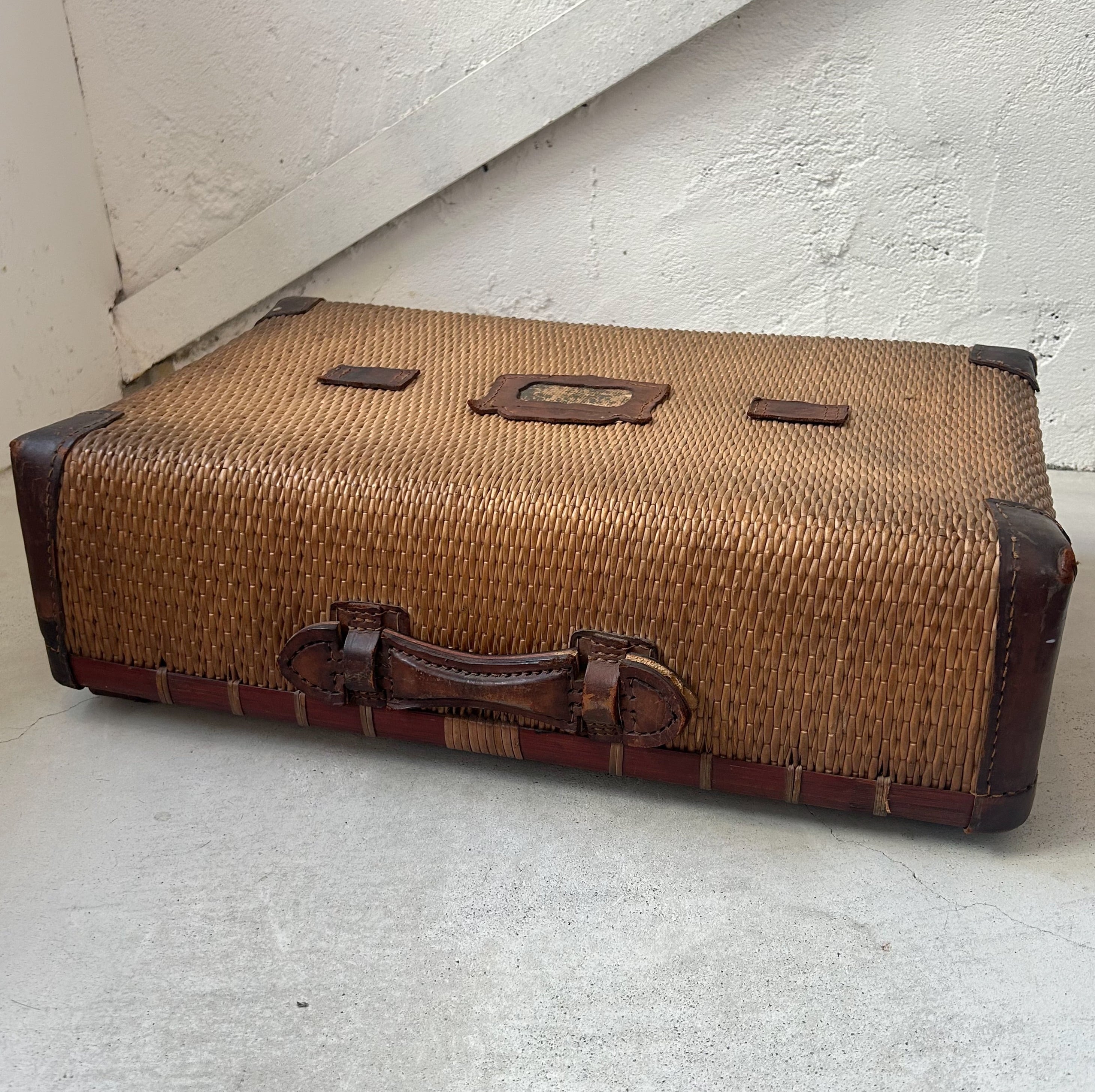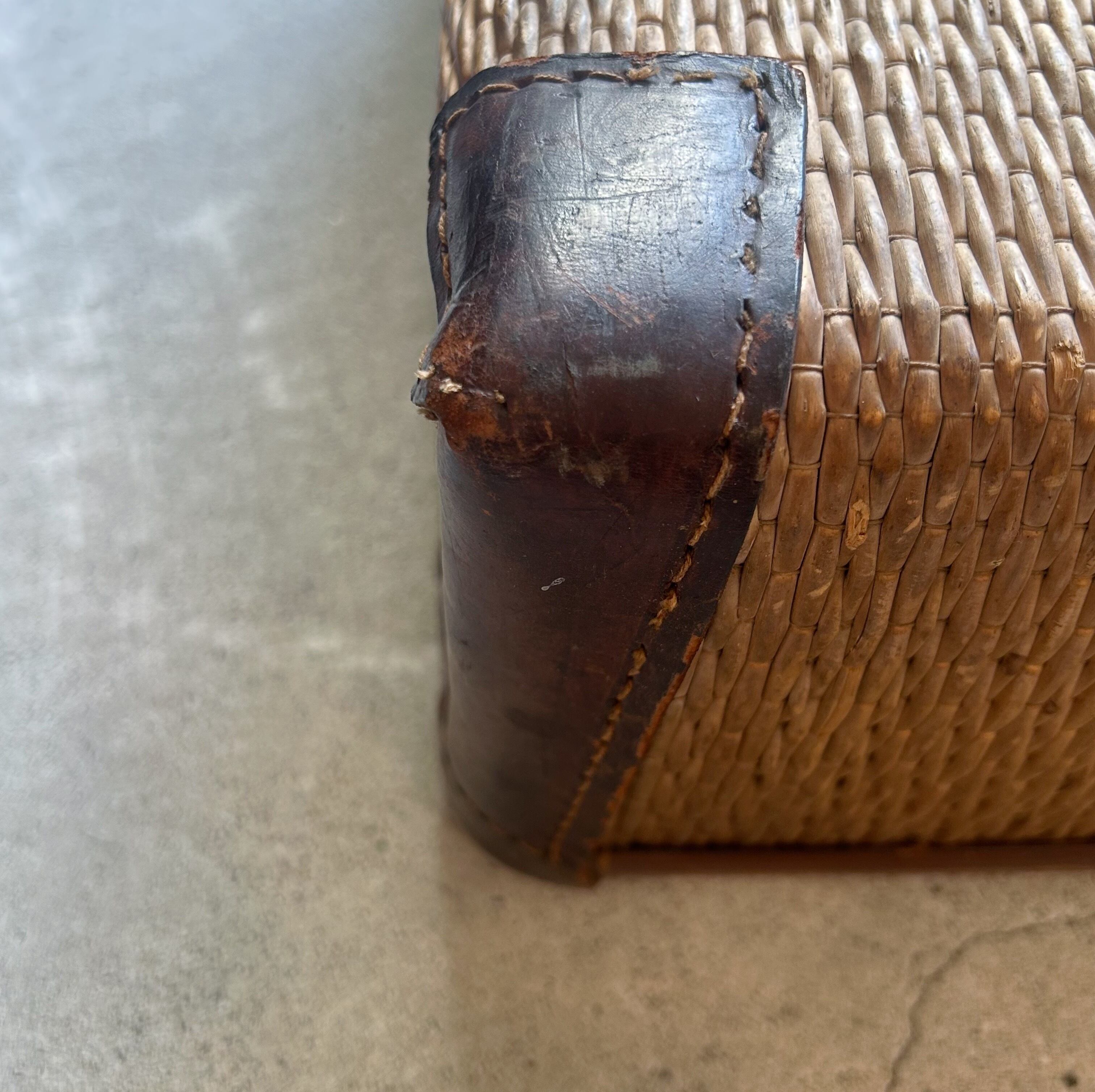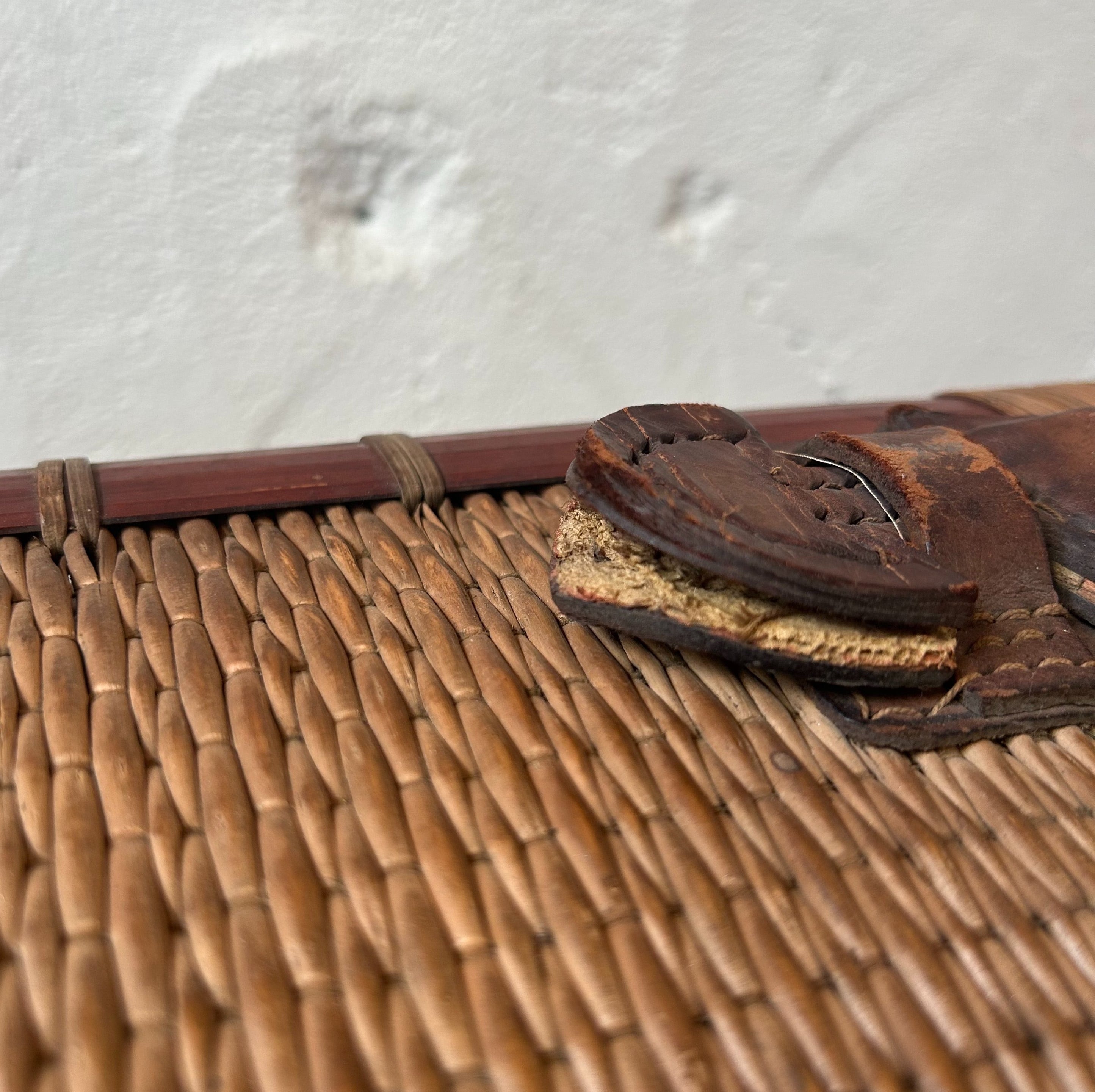 行李部分と持ち手や四隅などに使われている革、枠組に使われている竹部分ともに経年変化で深く味わいのある色味に。