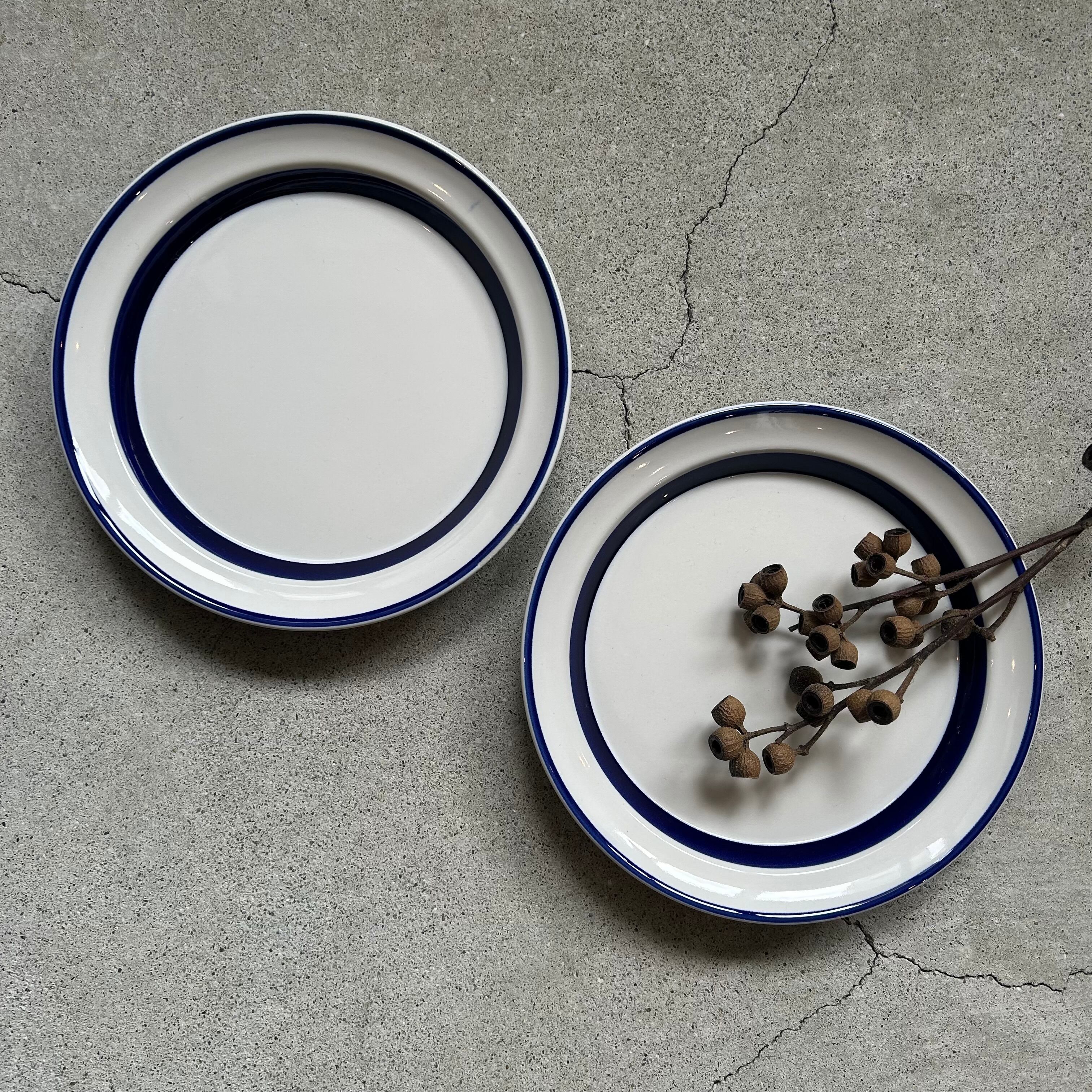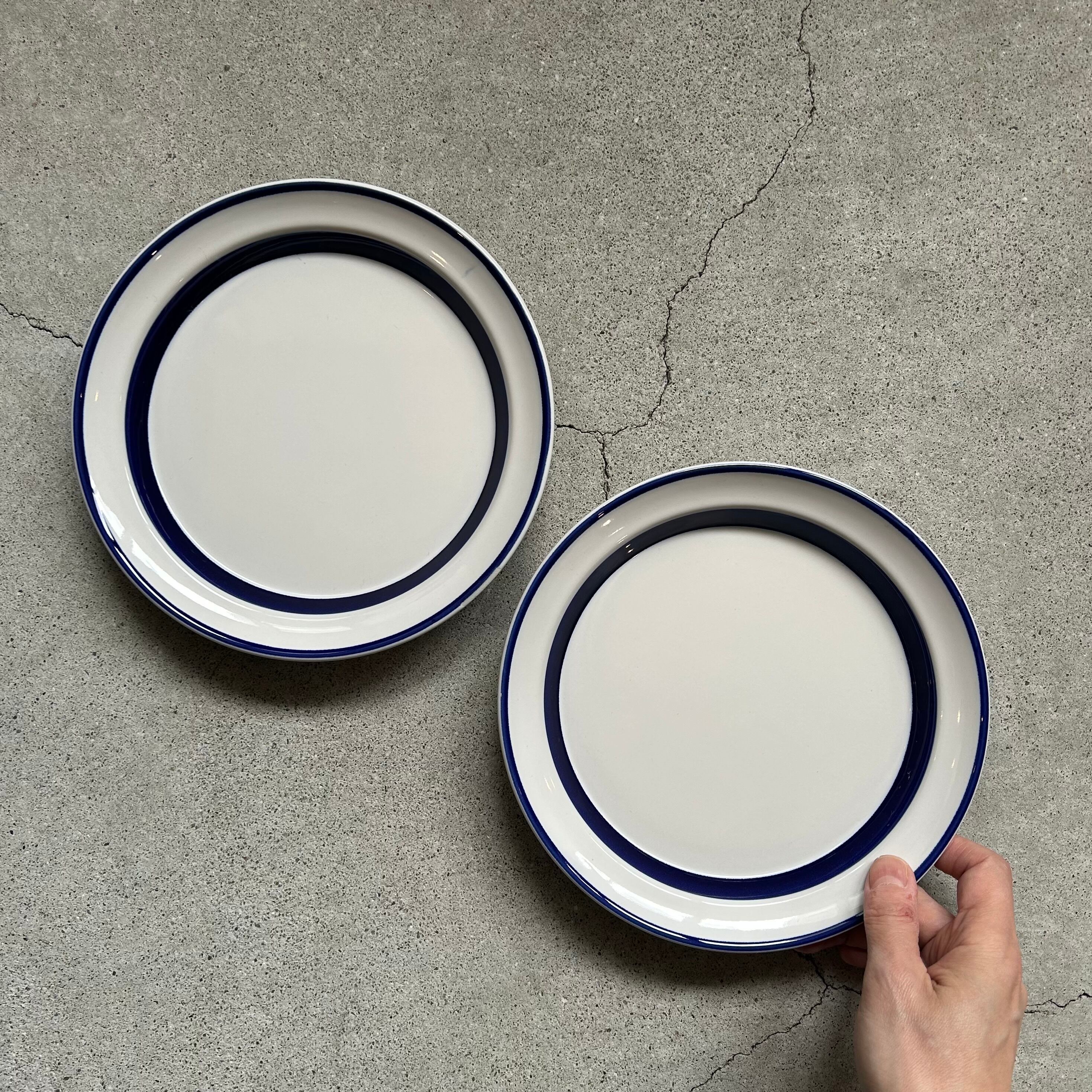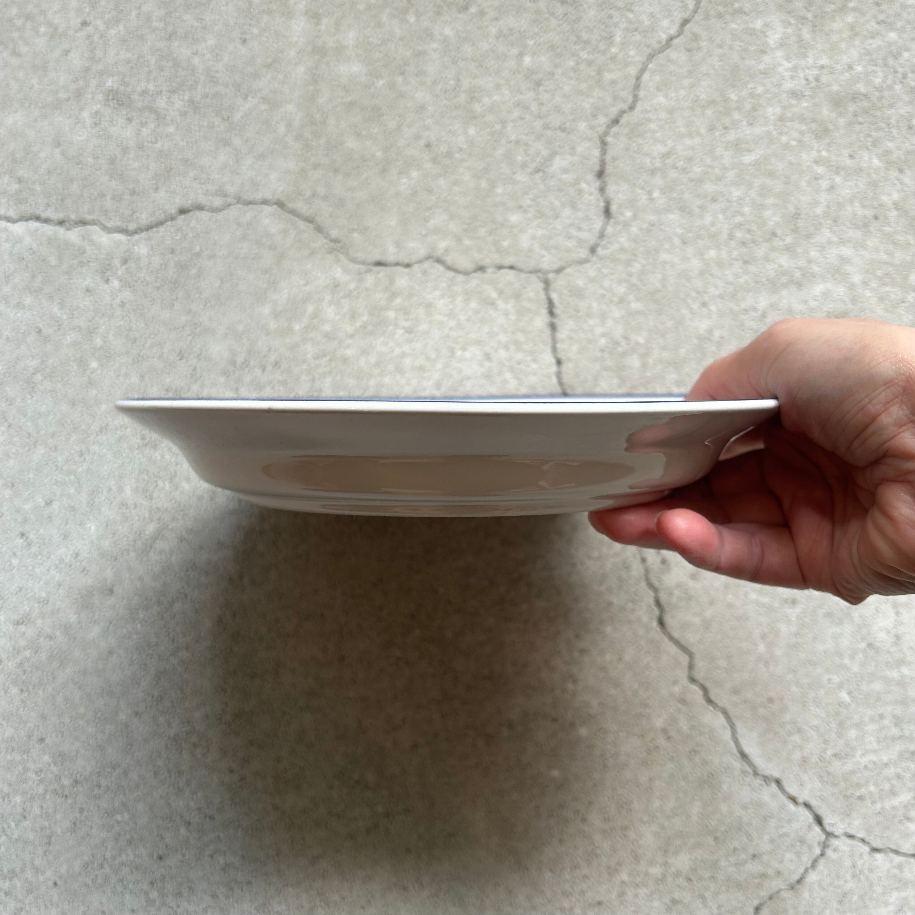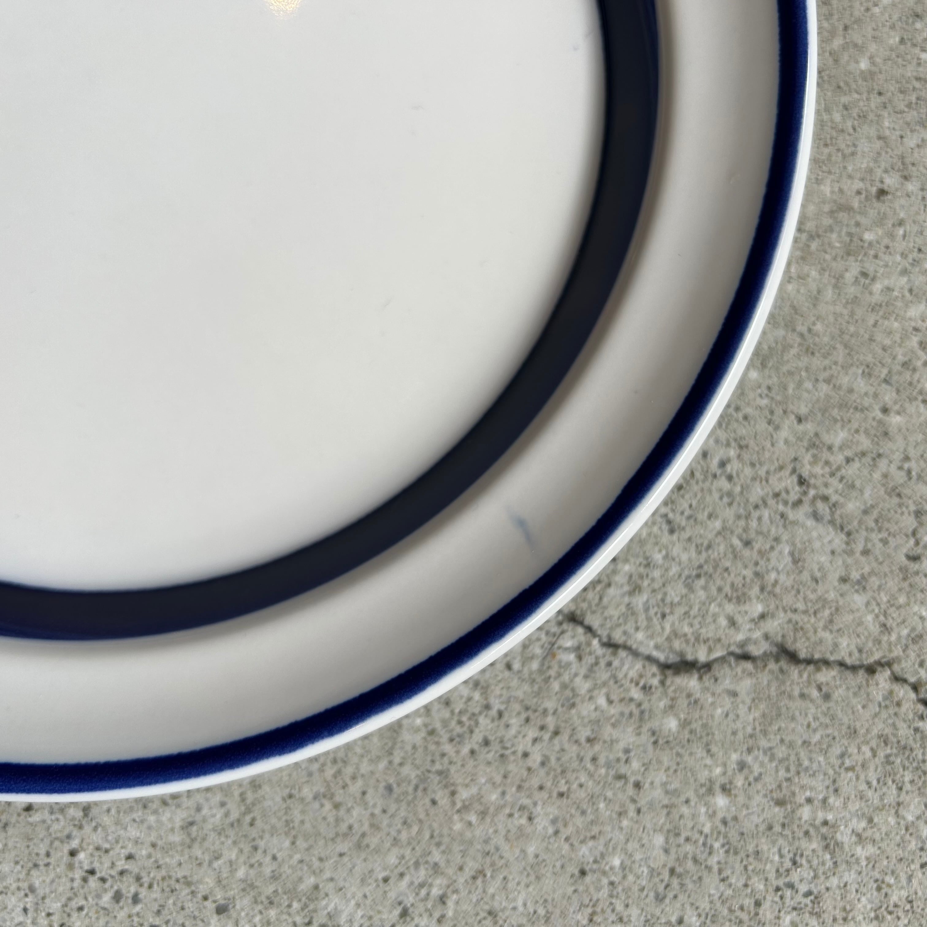 白地に深い藍色のライン入り。少し深さがあり、太い方のラインは器の立ち上がり部分に入っています。