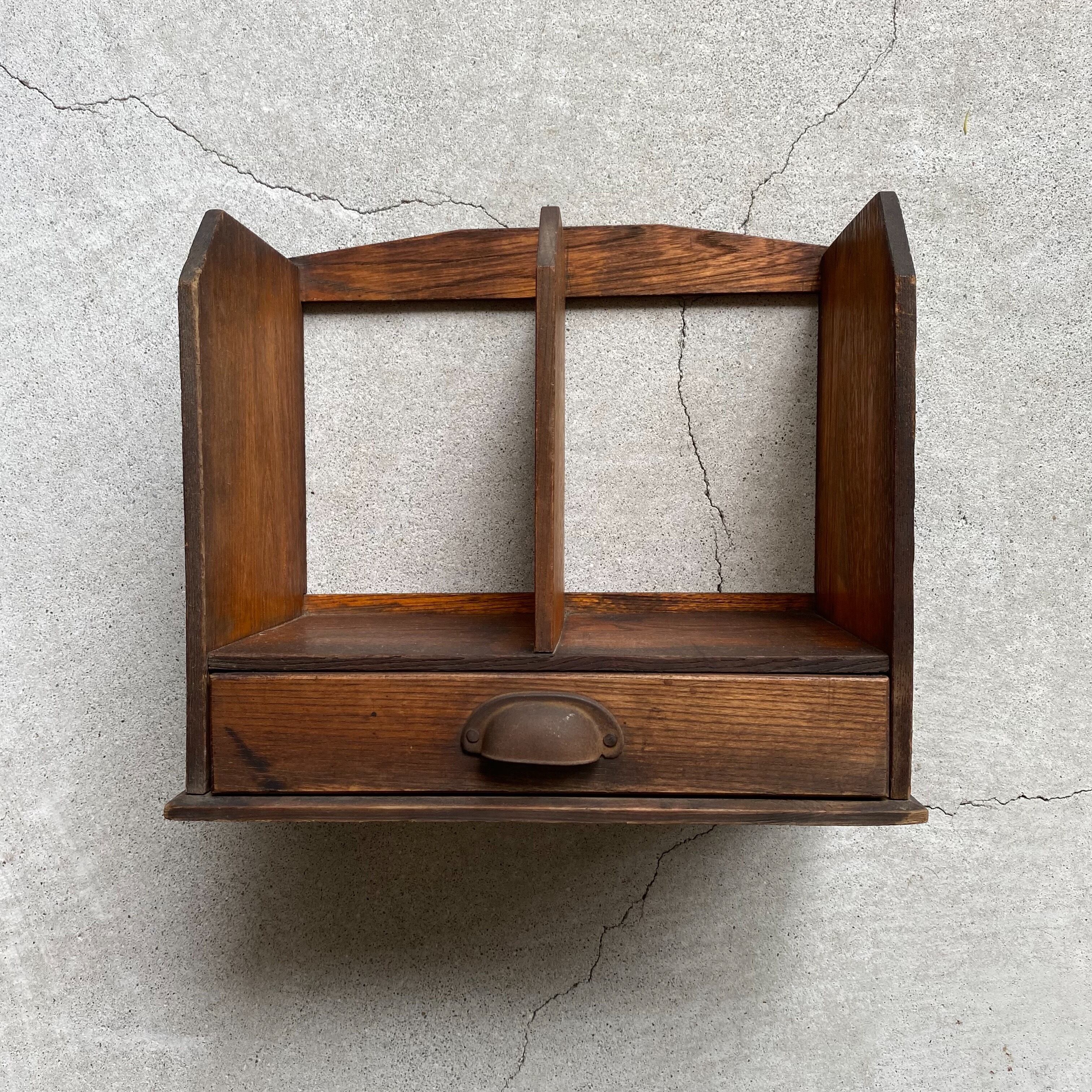 古い木製の本立てです。小さな引き出し付きで、文房具や印鑑などのちょっとした収納も可能です。