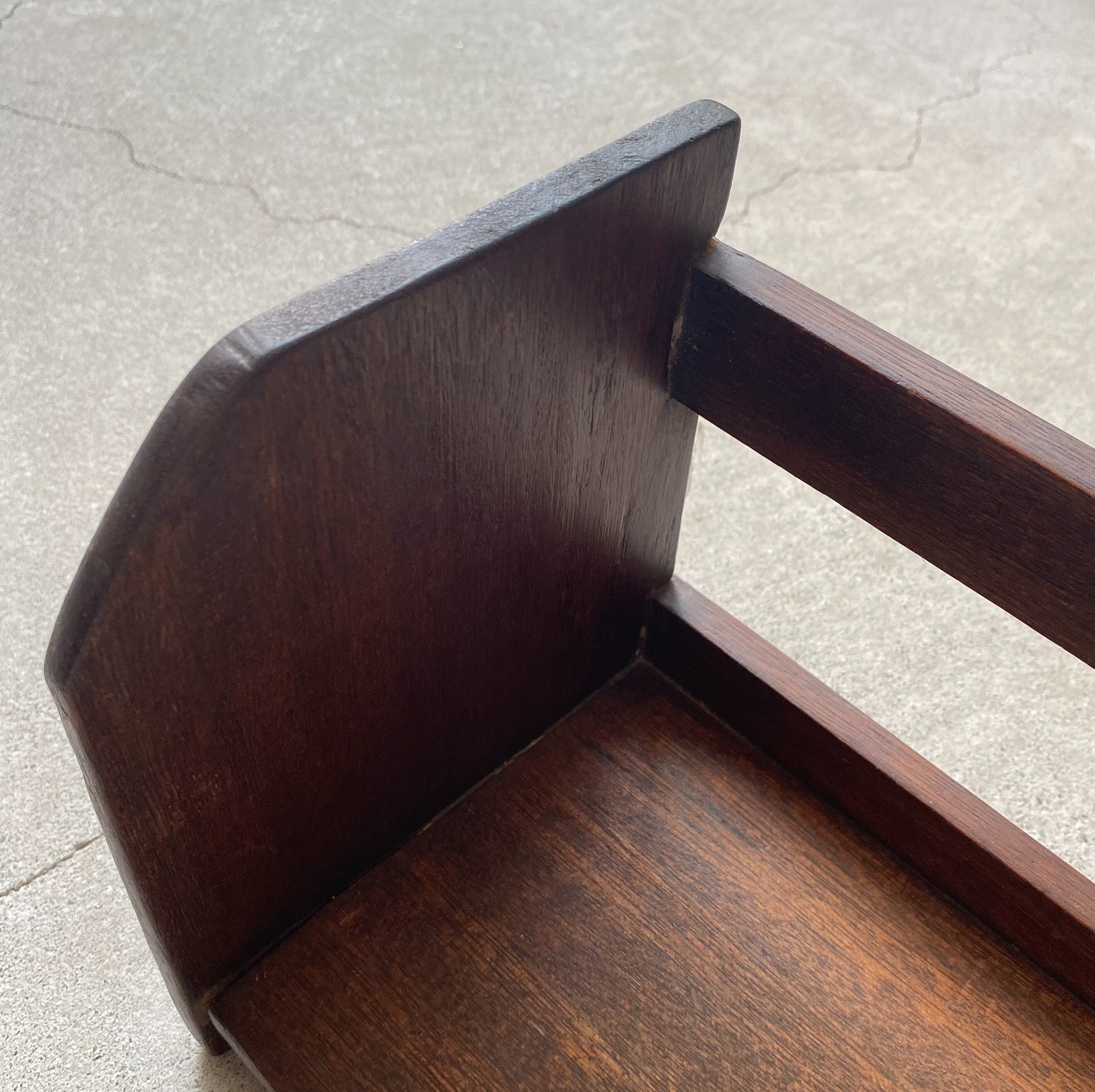 古い木製の本立てです。深いこげ茶色が落ち着いた雰囲気で、色・デザイン共にインテリアに馴染んでくれやすい形だと思います。